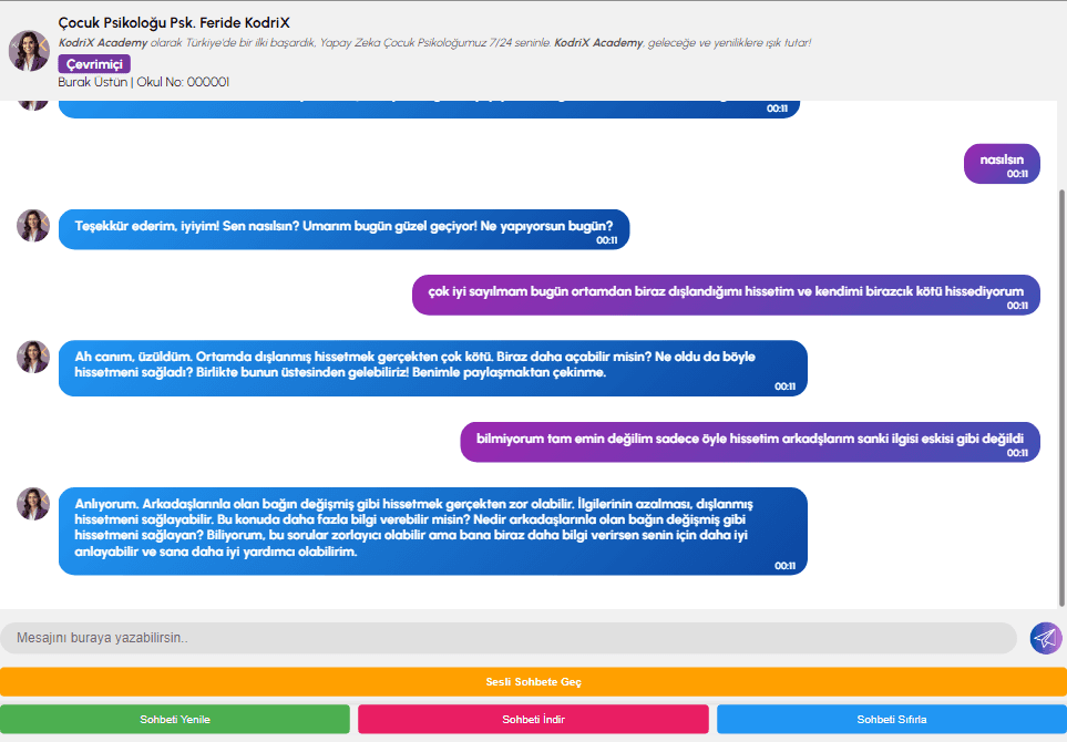 Feride KodriX, çocukların duygusal ihtiyaçlarına özel yanıtlar verir, onların güvenle konuşmalarını sağlar.